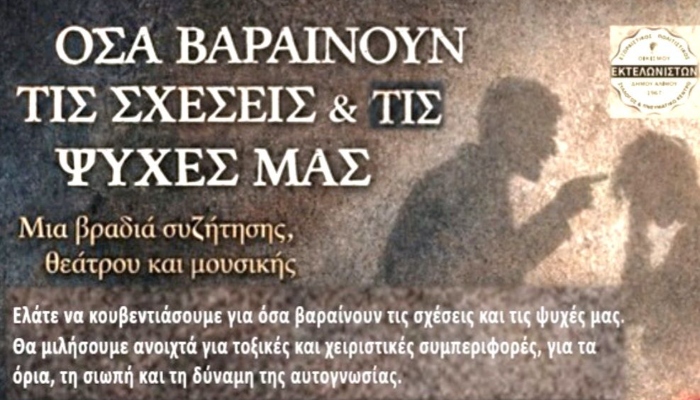 Ο Σύλλογος Εκτελωνιστών Αλίμου σας προσκαλεί σε μια ιδιαίτερη εκδήλωση που στοχεύει να ρίξει φως στις σκοτεινές πλευρές των ανθρώπινων σχέσεων και να αναδείξει τη δύναμη της αυτογνωσίας. Το Σάββατο 21 Μαρτίου 2026 στις 20:00, στο Πολιτιστικό Κέντρο του Δήμου Αλίμου (Λεωφόρος Ιωνίας 96, 1ος όροφος) θα συζητήσουμε ανοιχτά για όλα εκείνα που συχνά αποσιωπούμε.