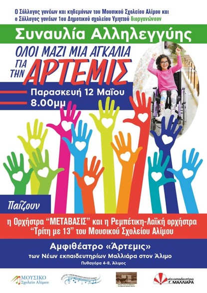 Ο Σύλλογος Γονέων και Κηδεμόνων του Μουσικού Σχολείου Αλίμου με τη συμμετοχή δυο Μουσικών συνόλων, της Ορχήστρας «Μετάβασις» και της Λαϊκής και Ρεμπέτικης Ορχήστρας «Τρίτη με 13» και ο Σύλλογος του 1ου Δημοτικού Σχολείου Υμηττού, διοργανώνουν αύριο Παρασκευή 12 Μαΐου στον Χώρο Τέχνης και Πολιτισμού «Άρτεμις» των Νέων Εκπαιδευτηρίων Γ. Μαλλιάρα (Πυθαγόρα 4-8. Άλιμος)στις 20:00,μια ξεχωριστή συναυλία.