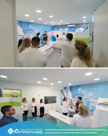 Στις εγκαταστάσεις του κέντρου μας πραγματοποιήθηκε εκπαίδευση του προσωπικού μας με θέμα τα αλλεργικά συμπτώματα που ενδέχεται να προκληθούν από τη χρήση σκιαγραφικών ουσιών σε εξετάσεις αξονικής και μαγνητικής τομογραφίας.