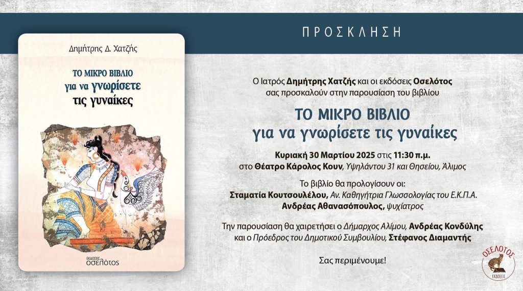 Ο γνωστός Αλιμιώτης γιατρός Δημήτρης Χατζής παρουσιάζει το βιβλίο του «Το μικρό βιβλίο για να γνωρίσετε τις γυναίκες» την Κυριακή 30 Μαρτίου, στις 11:30 το πρωί, στο θέατρο «Κάρολος Κουν» (Υψηλάντου & Θησείου).