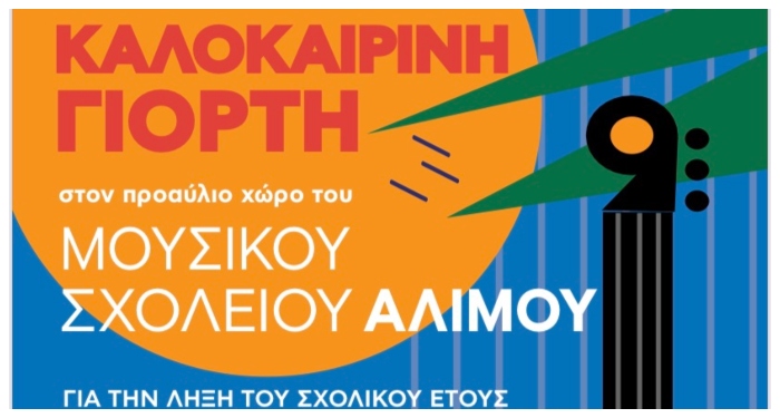 Τρίτη 27 Ιουνίου, στις 8 το βράδυ, στον προαύλιο χώρο του Μουσικού Σχολείου Αλίμου, καλοκαιρινή γιορτή για την λήξη του σχολικού έτους. Με μουσική, χορό, ποτό και φαγητό!