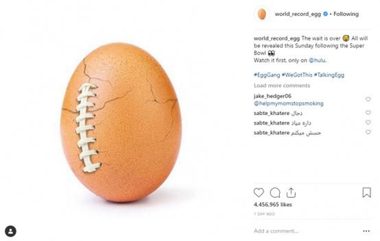 To πιο διάσημο αυγό του σήμερα, έγινε viral όταν αναρτήθηκε σε λογαριασμό του instagram Εgg-Gang , με την πρόκληση να καταρρίψει σε like και να εκτοπίσει την Kylie Jenner από την κορυφή. Ακολούθησαν άλλες 4 φωτογραφίες αυγών που σταδιακά εμφάνιζαν ρωγμές στο τσόφλι τους και στο τέλος το αυγό εμφανιζόταν με ράμματα. Το εν λόγο αυγό των 52 εκ. like αποδείχτηκε ότι ήταν πρωταγωνιστής της διαφήμισης της MKO Mental Health America, για την ψυχική υγεία, εστιάζοντας στους κινδύνους και την υπερβολική πίεση που ασκούν στους χρήστες τα social media.