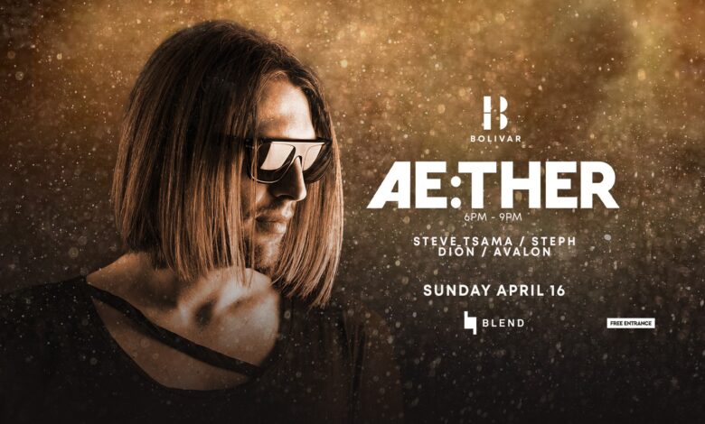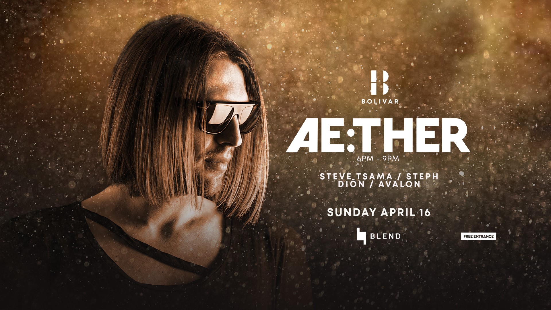 Κυριακή 16 Απριλίου Bolivar & Blend παρουσιάζουν τον δημοφιλή dj/producer AE:THER! Στο ενεργητικό του έχει μια σειρά από releases που αναδεικνύουν το απαράμιλλο ταλέντο του σε κορυφαία labels όπως Afterlife, Crosstown Rebels, Fabric και ένα καθώς και εμφανίσεις σε festivals όπως Get Lost Miami, Tomorrowland, Audioriver. Ο καλλιτέχνης με καταγωγή από την Ρώμη και έδρα το Βερολίνο, έρχεται για πρώτη φορά στο Bolivar σε ένα μοναδικό sunset event. Μαζί του οι Steve Tsama, Steph, Dion, Avalon.