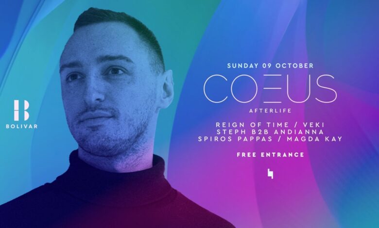 Κυριακή 9 Οκτωβρίου Bolivar και Blend παρουσιάζουν ένα sunset event με τον dj/producer Coeus. O Σέρβος καλλιτέχνης με αρκετά releases σε Afterlife, Atlant, Oddity, Moblack να έχουν βρεθεί στο top 100 των charts, και συνεχής υποστήριξη από Tale Of Us, Solomun, Dixon, Adriatique, κατατάσσεται ανάμεσα στα κορυφαία international acts. Μαζί του οι resident djs του Blend Reign Of Time & Veki και οι Steph b2b Andianna, Spiros Pappas, Magda Kay