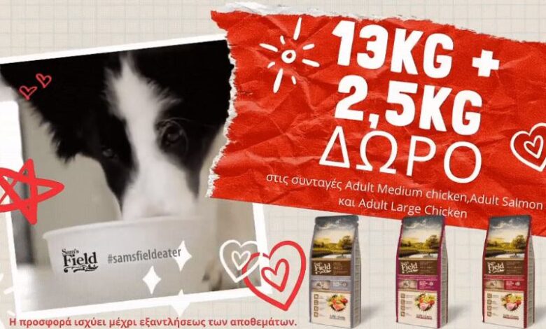 Και λίγο πριν τις καλοκαιρινές διακοπές🏖…..PetJoint και Sam’s Field Cosmos Pet Supplies Ltd προσφορές🤩🥳!!Με κάθε αγορά 13kg συσκευασίας Sam’s Field μια συσκευασία 2.5kg ΔΩΡΟ🎁!!!!